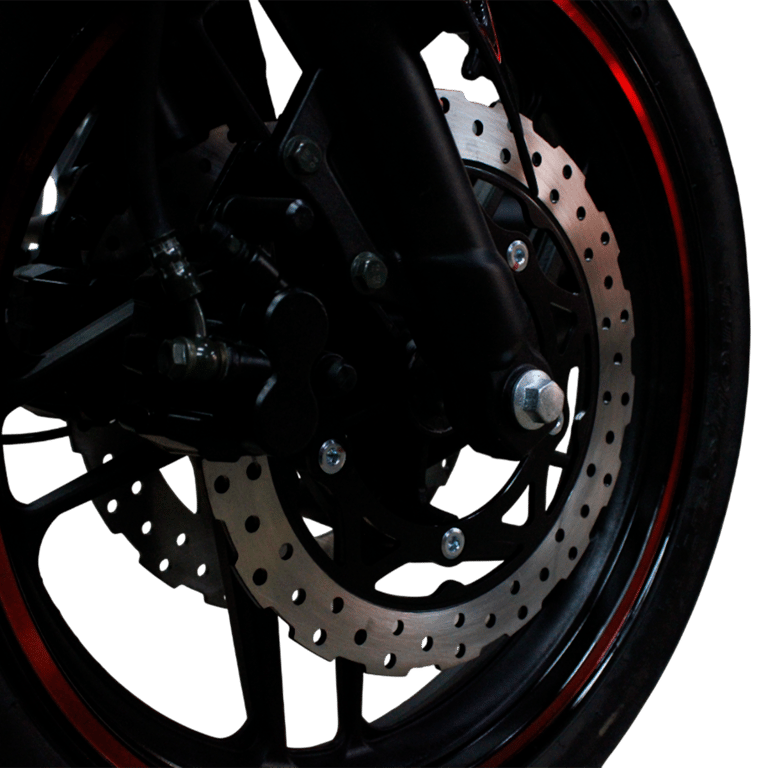 La RM300 cuenta con un sistema de frenos de disco para una detención potente y segura, llantas deportivas 110/70-17 en el frente y 140/70-17 atrás, y un asiento a 770 mm de altura que permite una posición comprometida con la conducción deportiva. Con un peso de 139 kg, mantiene una excelente relación potencia-peso.